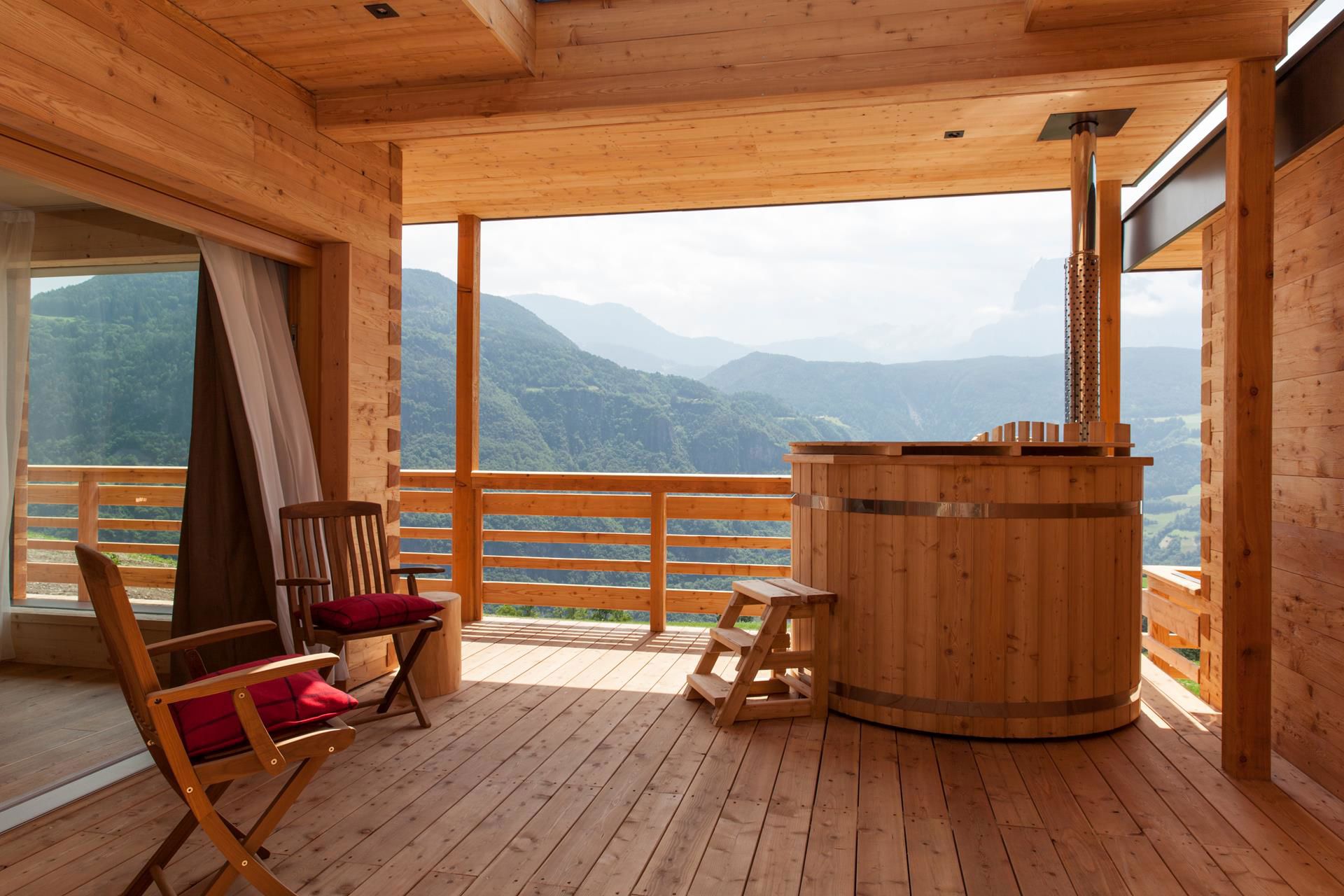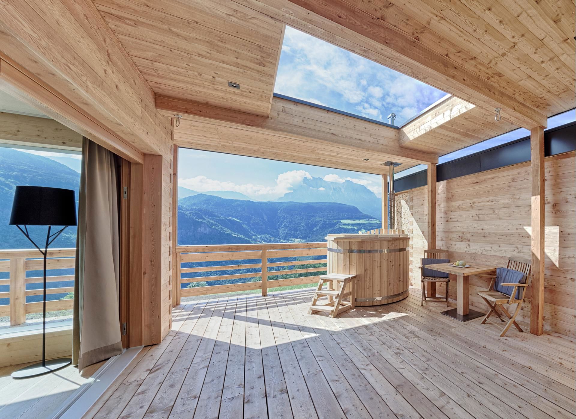 The new chalets are located in the garden at Pennhof and offer a singular view of the Dolomites. Elements of Swiss pine, larch timber, and clay give the chalets their distinctive atmosphere. An orthopedic sleep system, metal-free bed frame and a cellulose mattress, particularly convenient for allergy sufferers, offer optimal sleeping comfort. A bathing barrel and an integrated wooden stove guarantee relaxing hours at the chalets. The option of a net de-energizing switch ensures the chalet will be free from electromagnetic rays of any kind.